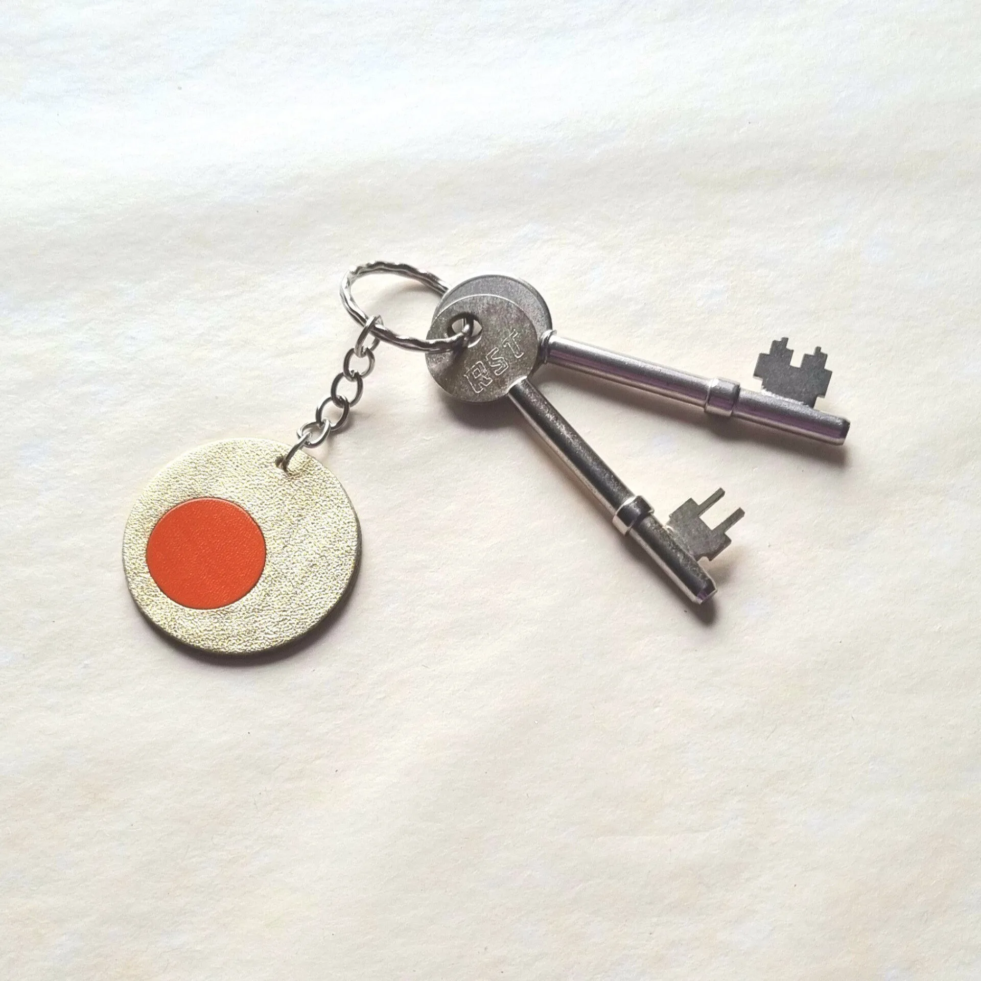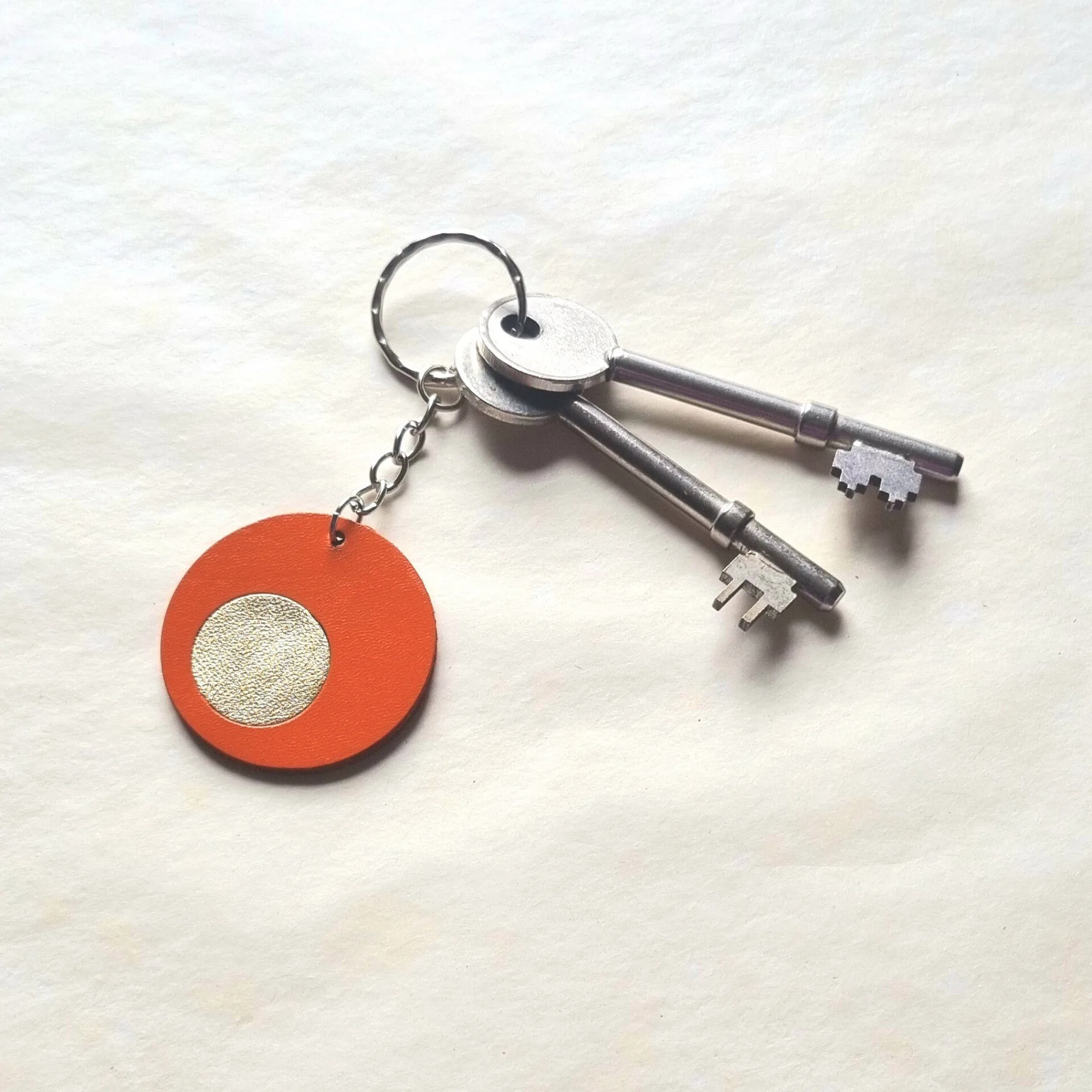 £14.00Add a pop of sustainable colour to your day with this handcrafted leather keyring in orange and gold, made from leather offcuts.