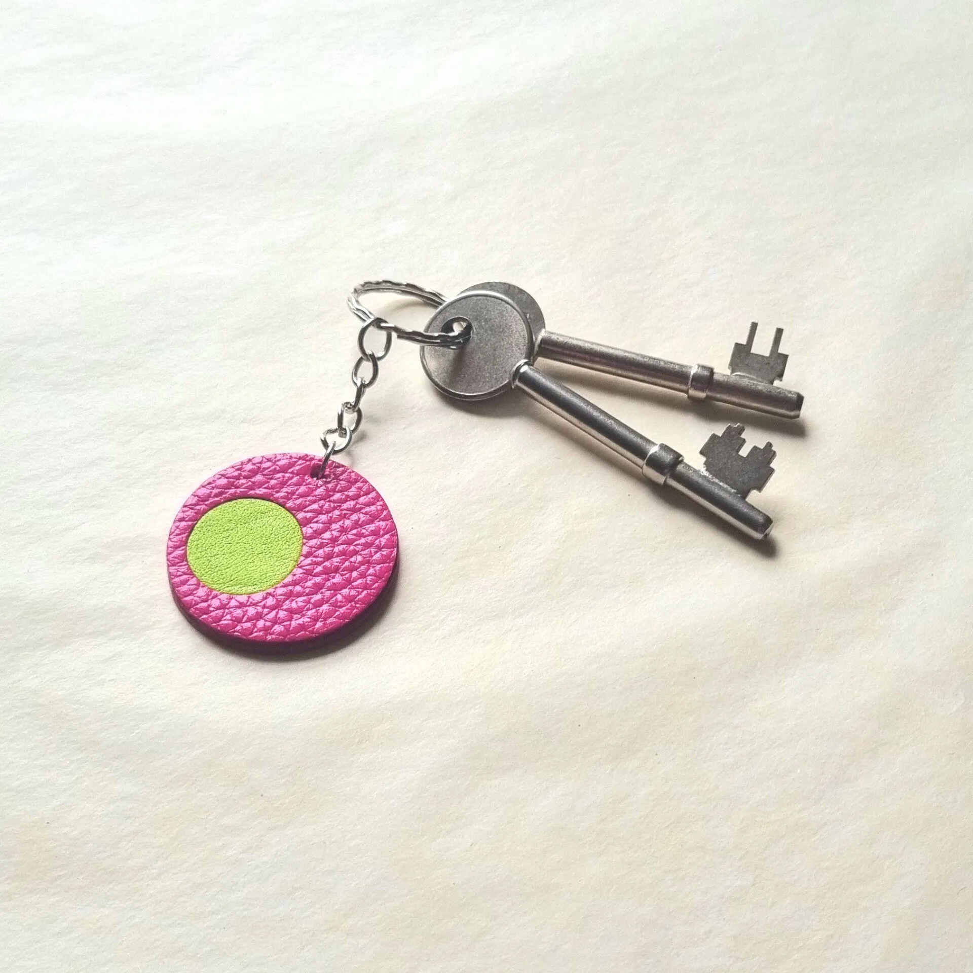 £14.00Add a bold pop of sustainable colour to your everyday with this handcrafted leather keyring in pink and acid yellow, made from leather remnants.
