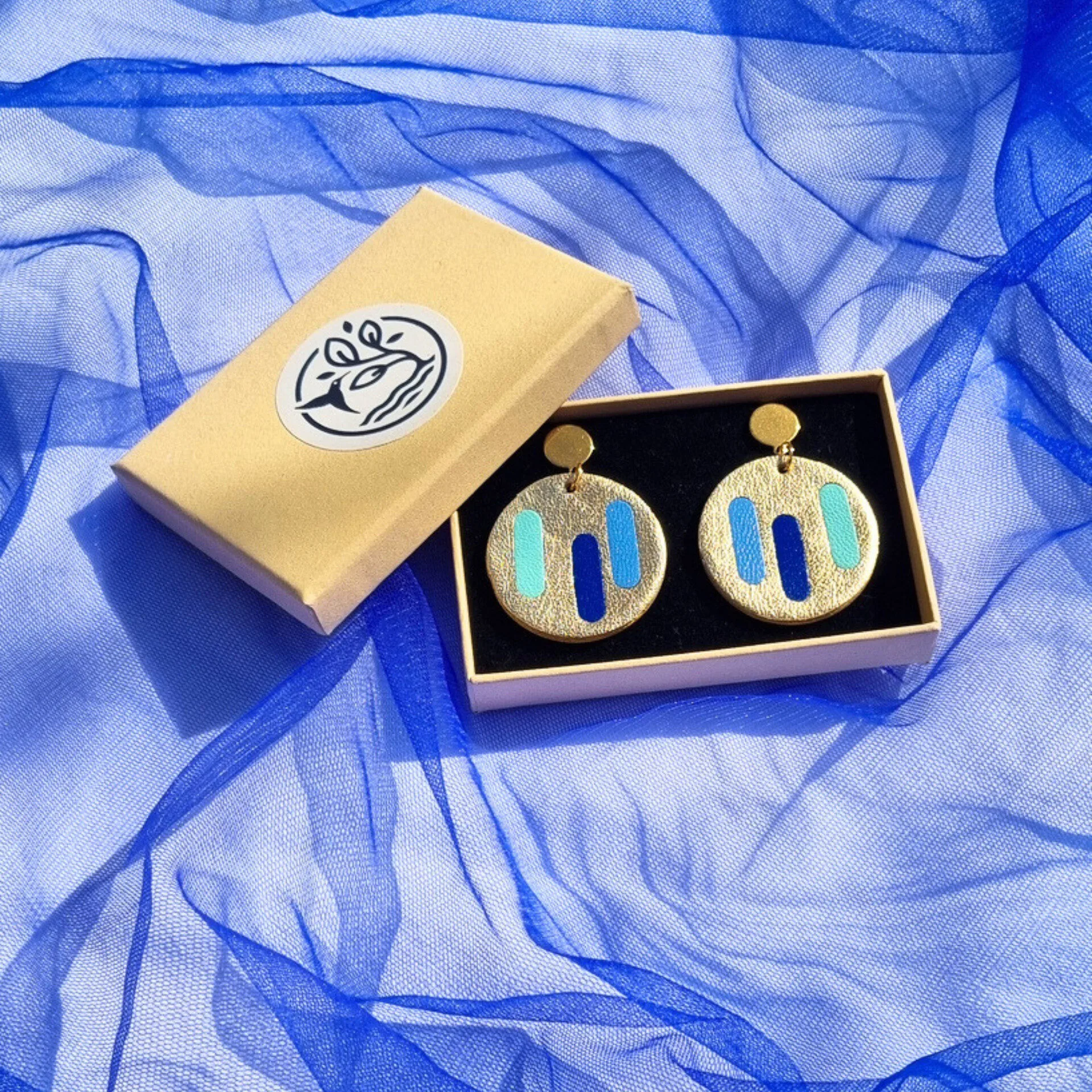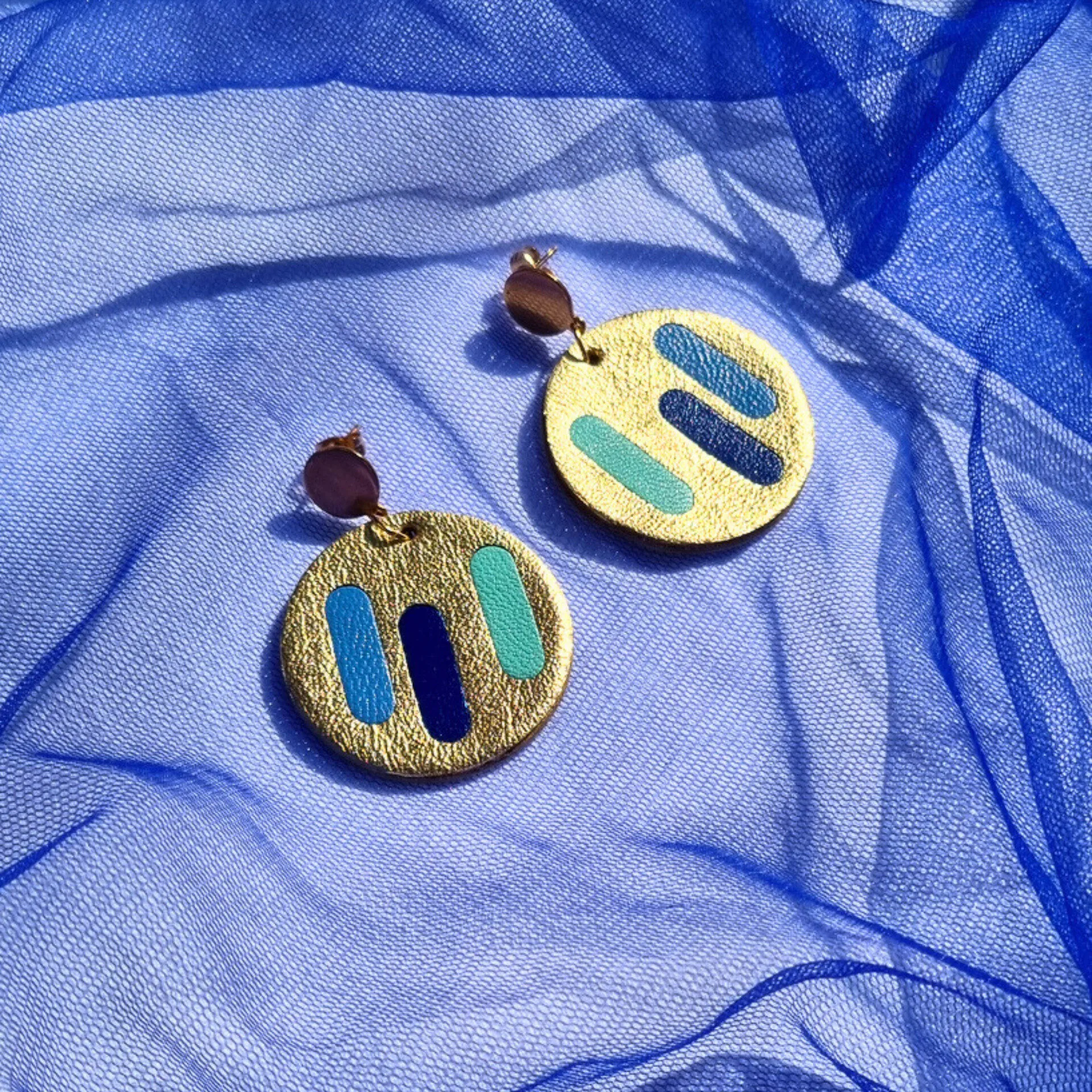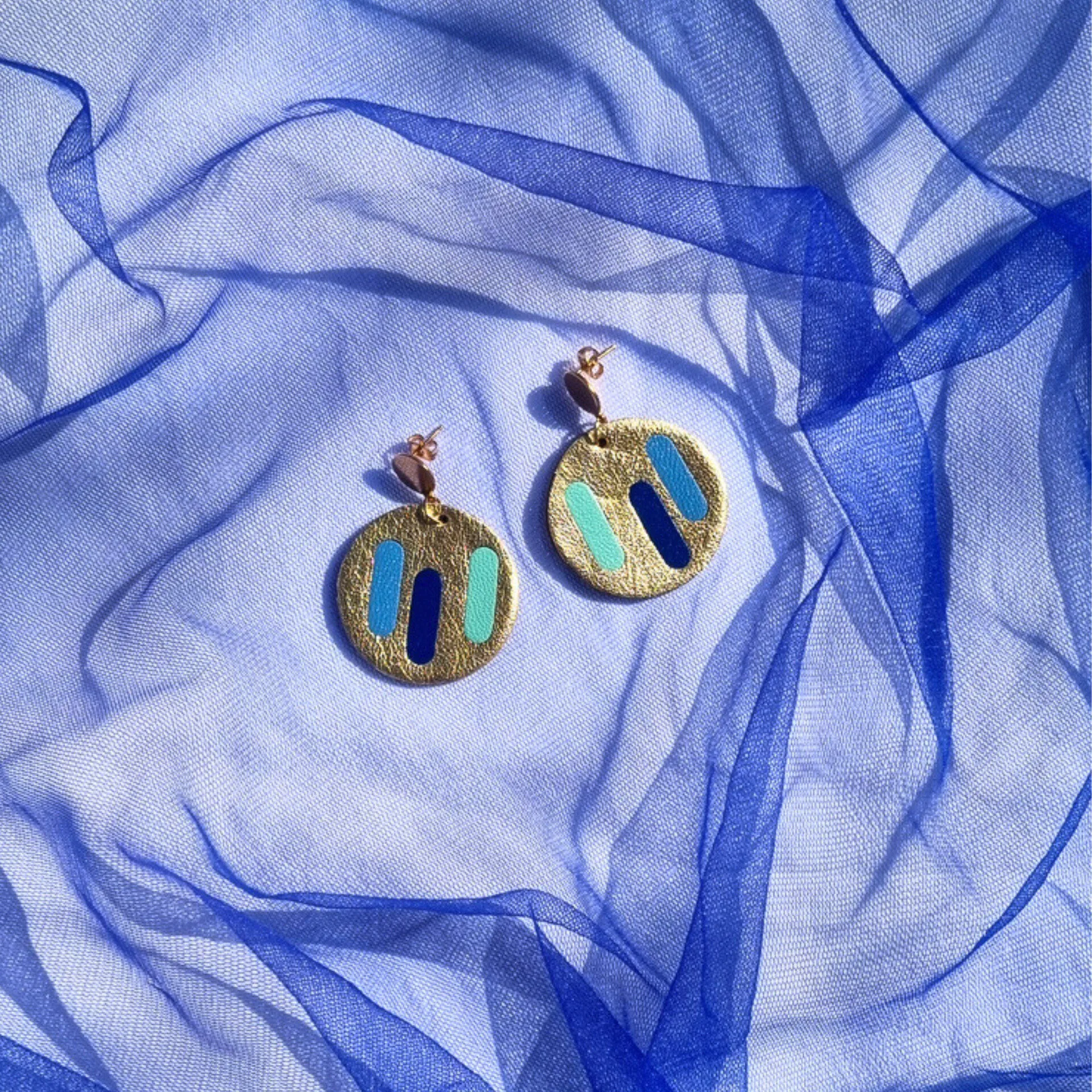 Bring a fresh, modern look to any outfit with these beautiful disc statement earrings. Combining a classic gold circular shape with a cool palette of blues, these earrings are designed for those who want a unique, handmade accessory that’s easy to wear.
