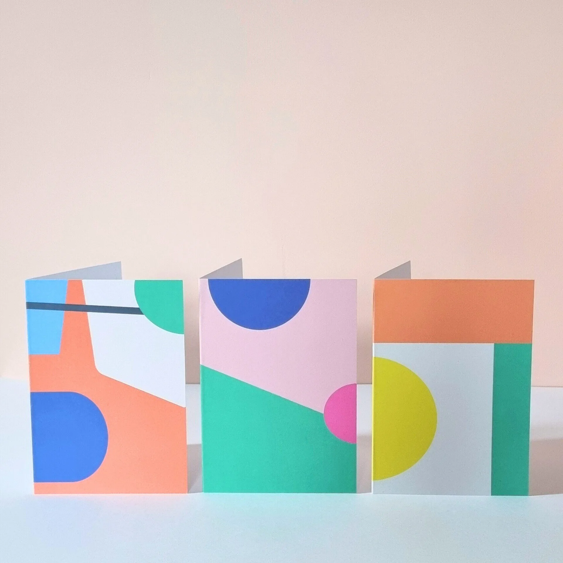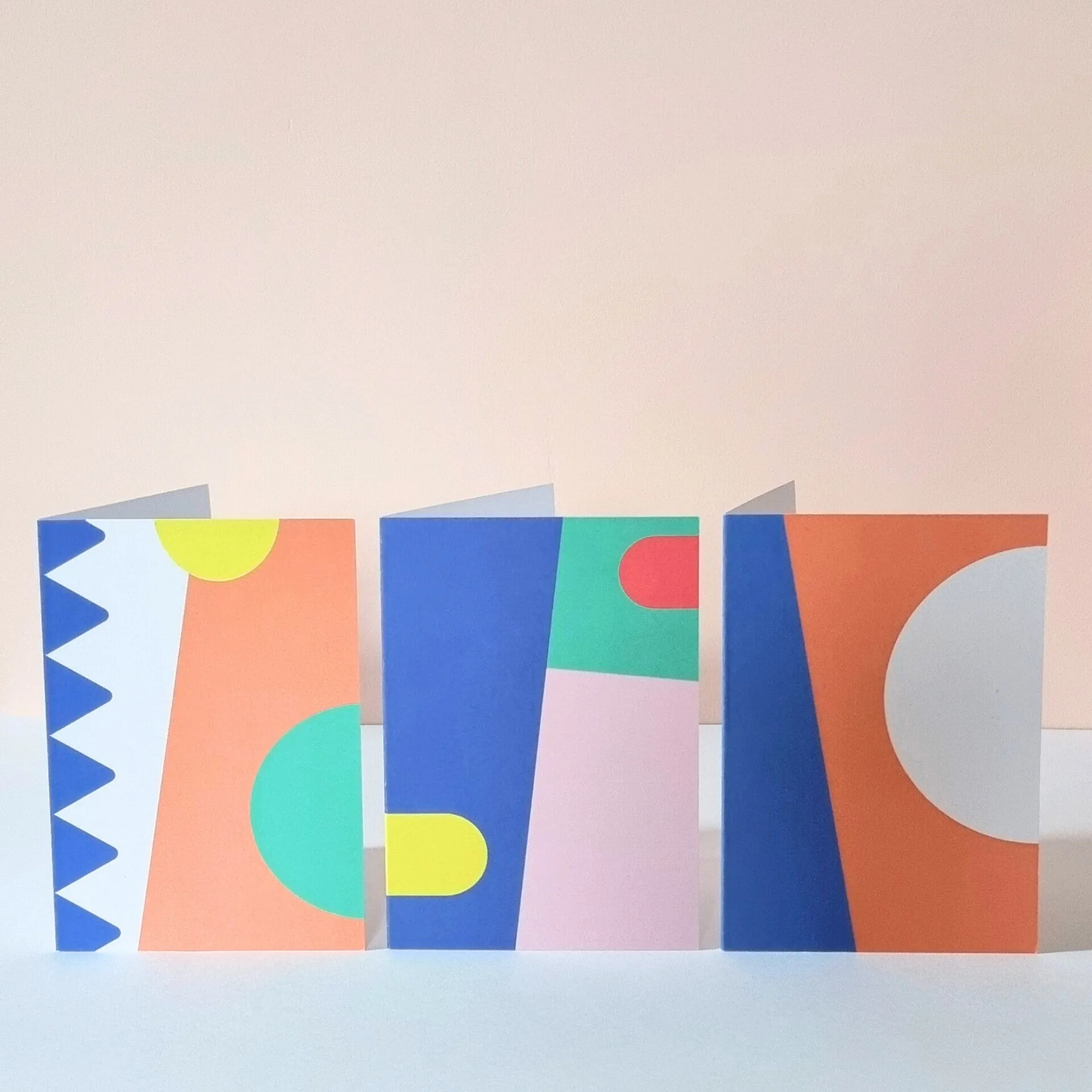 Make a bold statement with this contemporary greetings card, featuring a vibrant geometric design inspired by my mural paintings and jewellery collections. This particular design is taken from an outdoor mural in a client’s garden. The artwork combines rich cobalt blue, a warm coral-orange, a soft green and a bright blue with a charcoal accent line – creating a playful yet balanced composition full of colour.