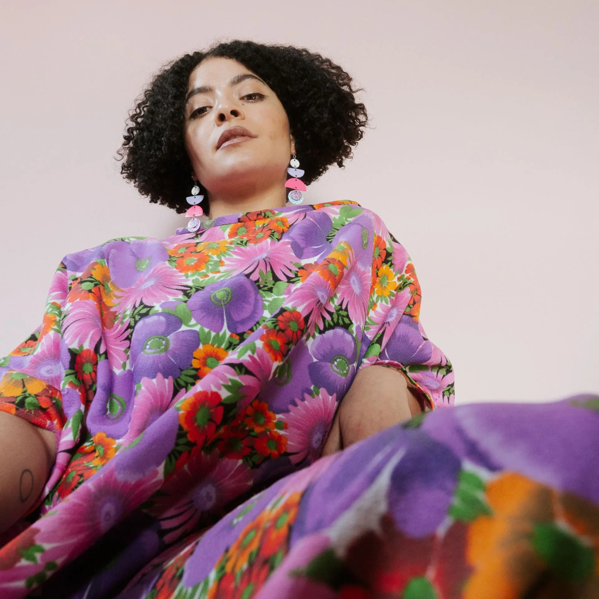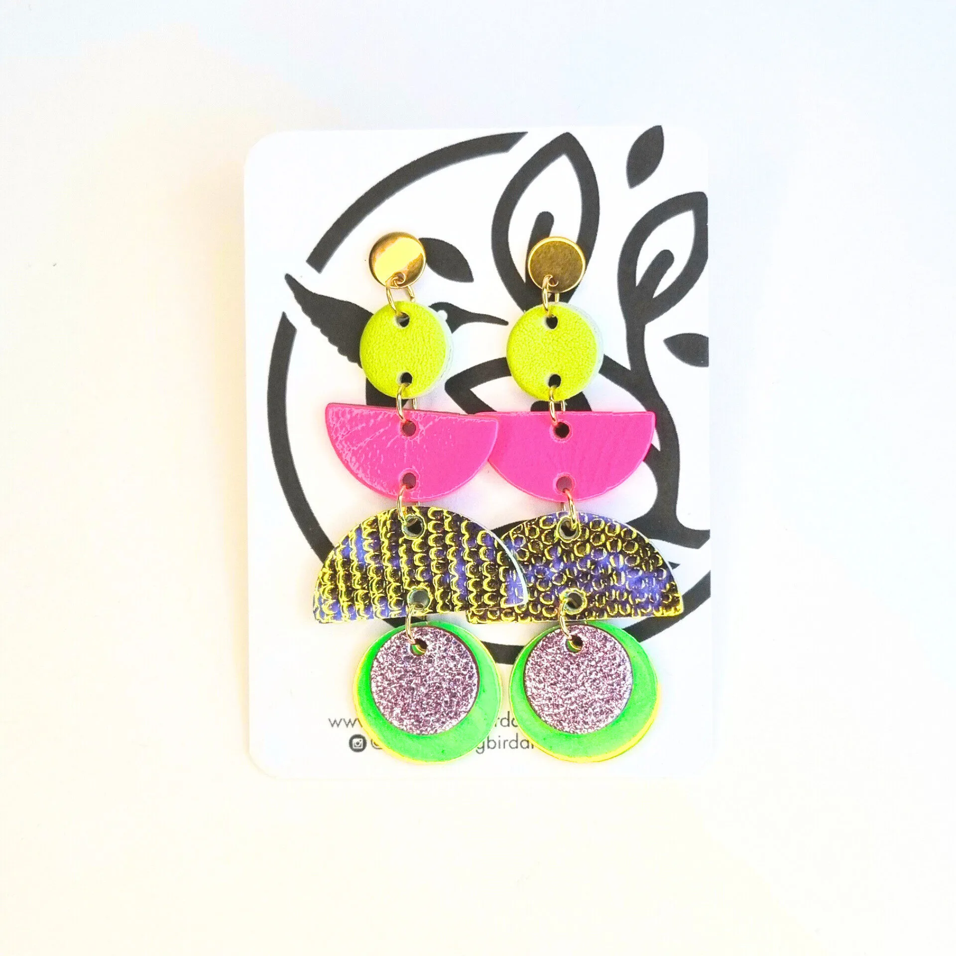 These striking earrings feature a joyful palette of neon yellow, bright pink and soft lilac, beautifully contrasted with holographic green pieces that catch the light beautifully. The playful geometric shapes give the earrings a modern and slightly futuristic feel—ideal for elevating everyday outfits, adding sparkle to evening looks or completing a full on colourful ensemble. Because they’re created from repurposed leather, they are really lightweight, ensuring all-day comfort without making your ears sore -perfect for festivals, nights out and long days on the go.