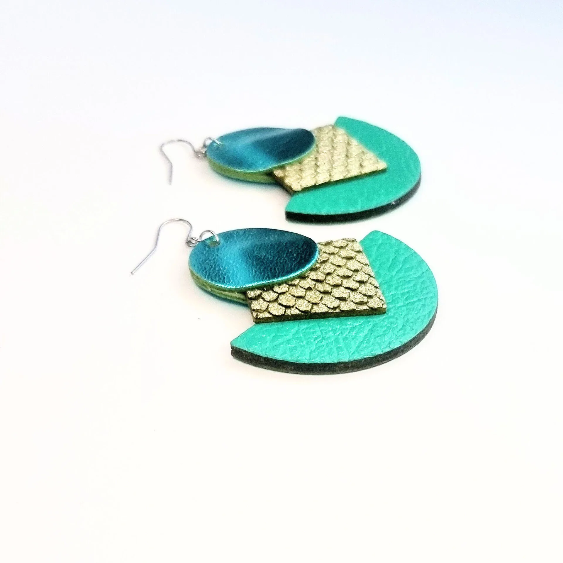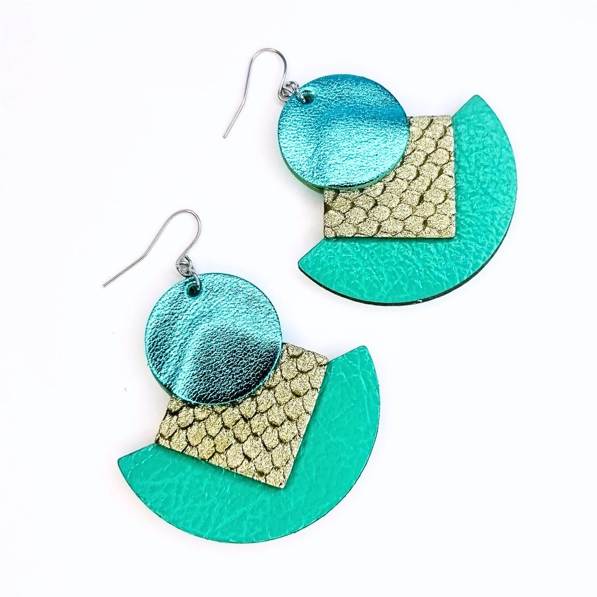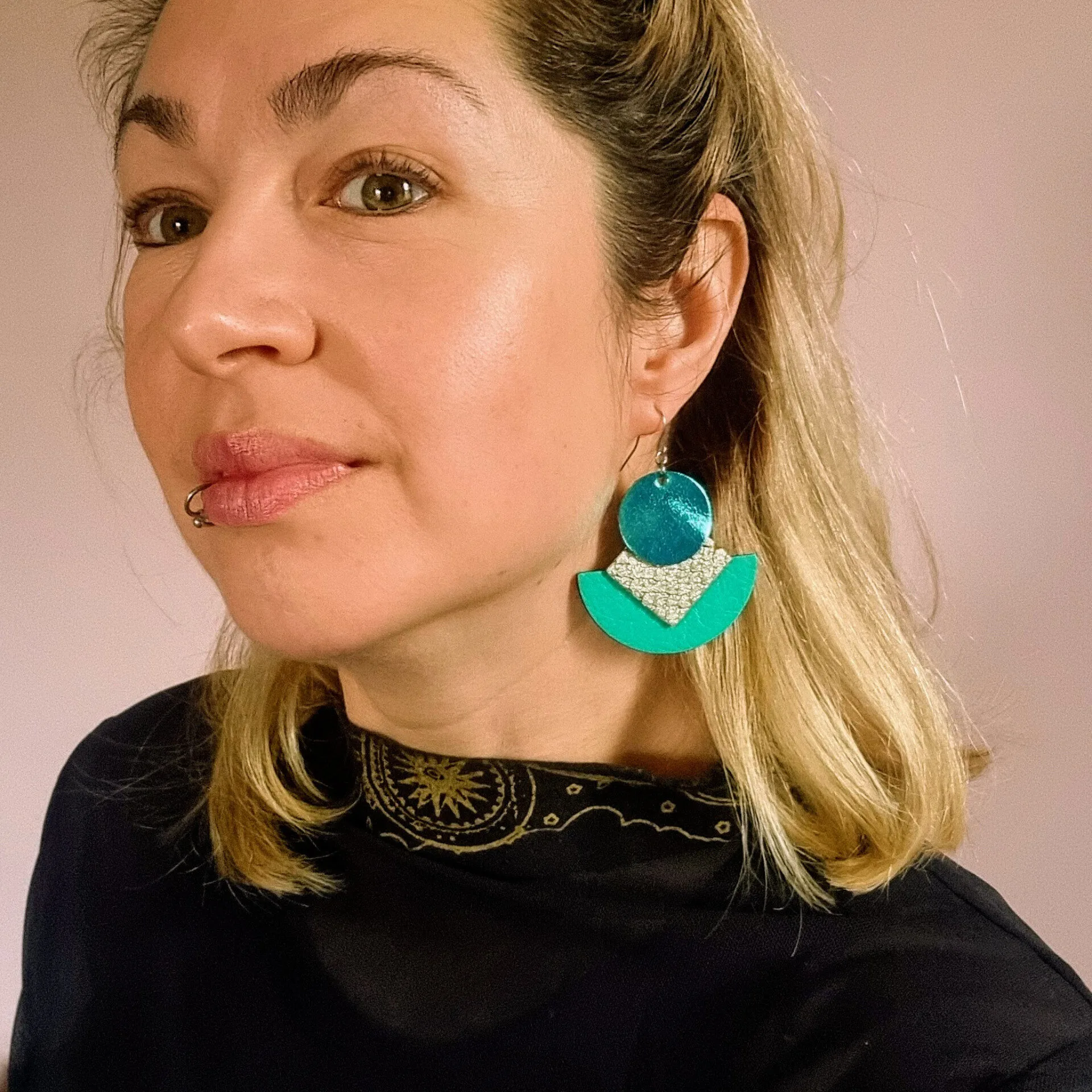 Each pair features a striking layered combination of shimmering metallic turquoise circles, textured gold diamond shapes and smooth turquoise semicircles. The geometric arrangement creates a playful, slightly art deco shape that moves beautifully and catches the light as you move. With their dreamy mix of metallic shine and bright colour, these earrings are perfect for anyone who wants to elevate everyday outfits or add a fun, expressive accessory to special looks.